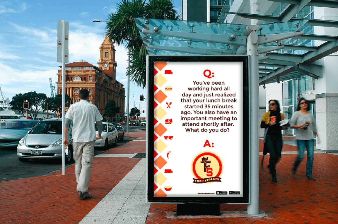 Bus ads (inside and out), benches, and bus stops will be used to spread awareness about Food Stalker. We primarily want to flood areas where business people frequent and utilize the space between their daily commutes to and from work.
