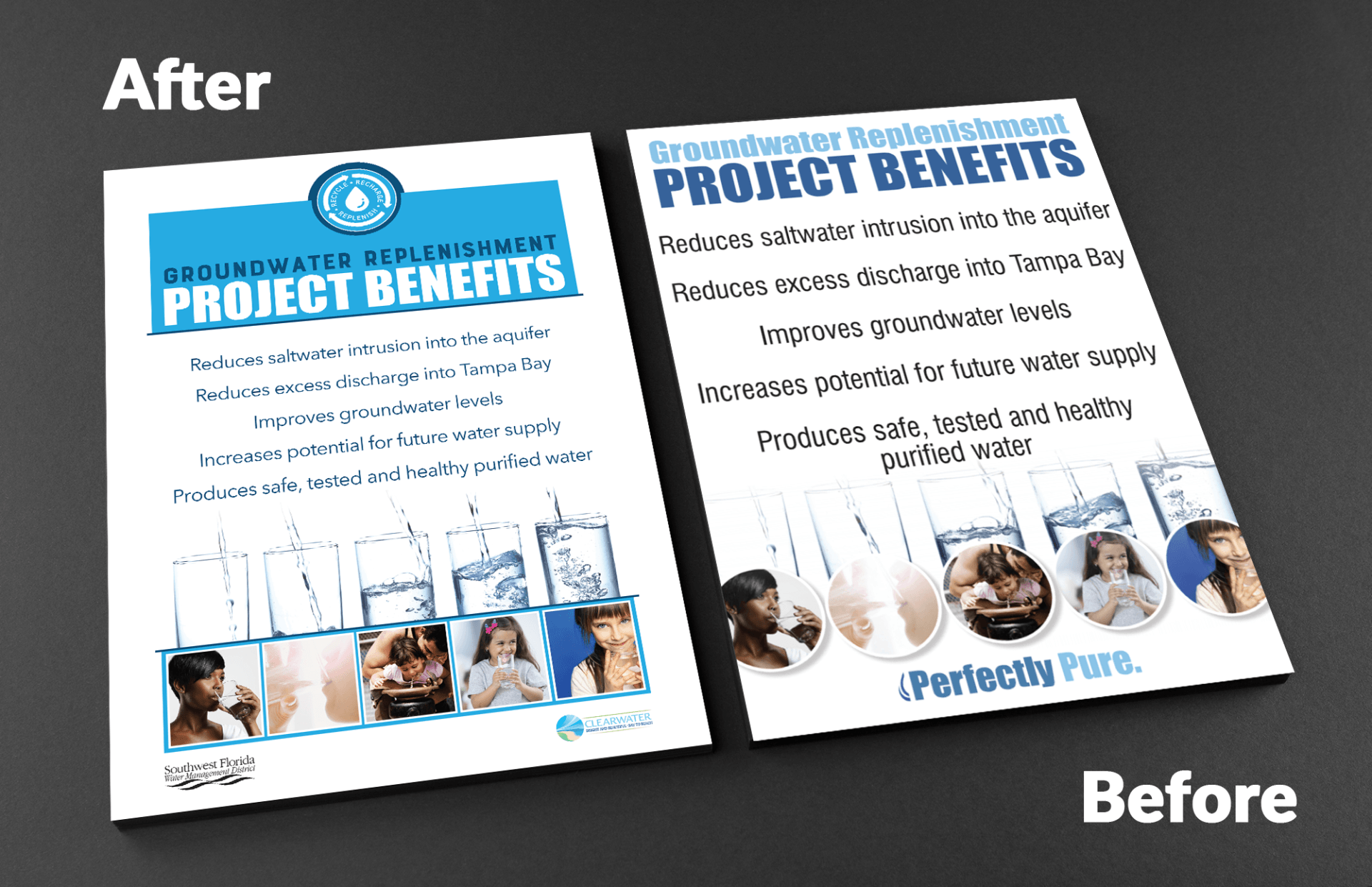 Project that informs people about what groundwater replenishing can do for the community. The initial flier had outdated logos and needed updating. The client liked the look of the first flier but asked if it could be "improved". This was my take.