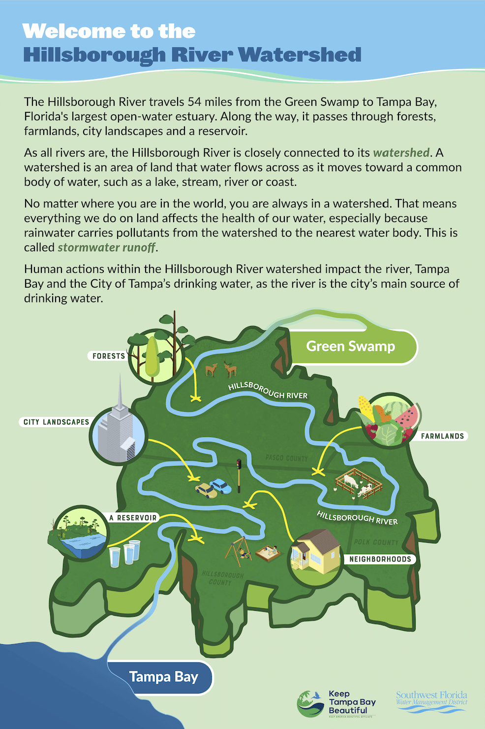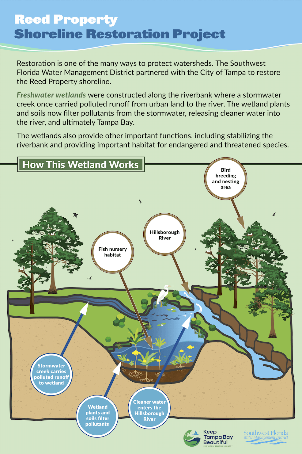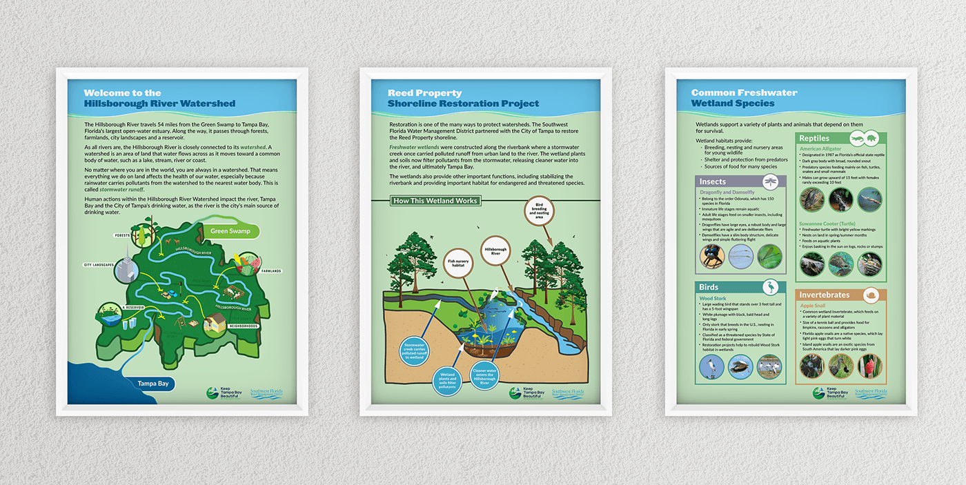 The distrcit works with schools to create learning materials to help them understand water bodies, systems and things that could be important to water intake and everyday use. These poster are in association with "Keep Tampa Bay Beautiful", an affiliate of Keep America Beautiful. These panels (24x36") are used to show students how land restoration can help improve water quality and how it is important especially when that same water supply is a main resource for a city as populated as Tampa.