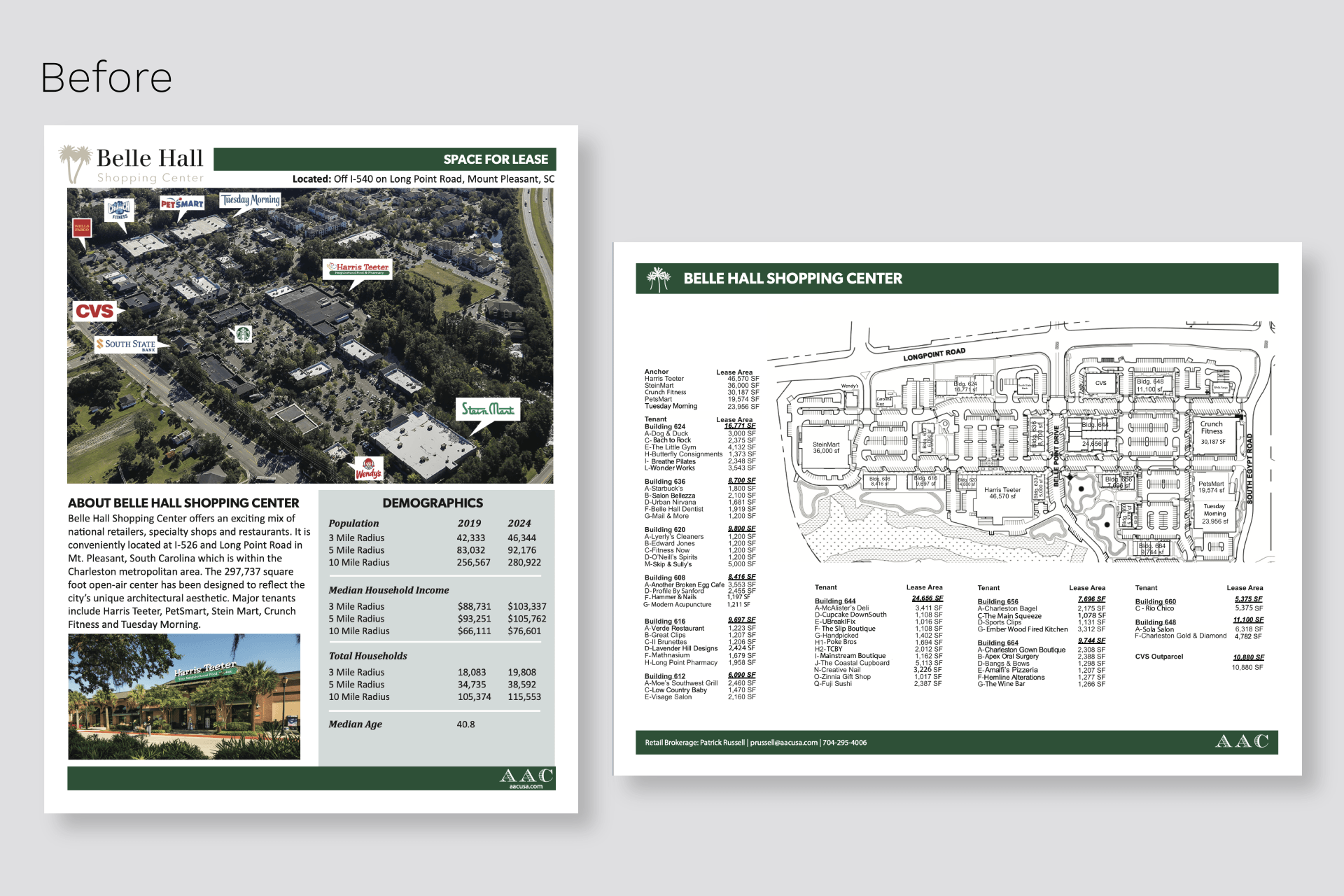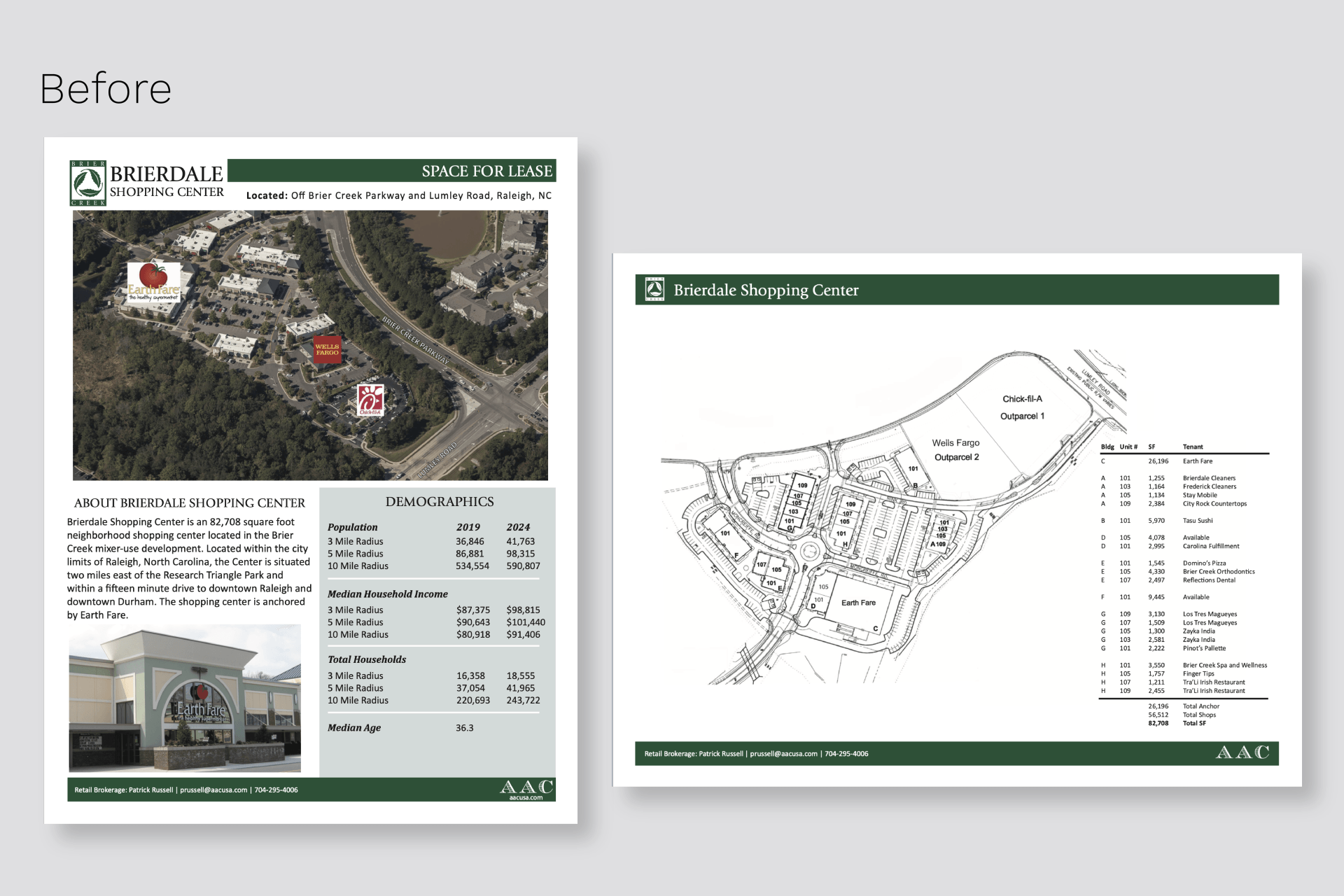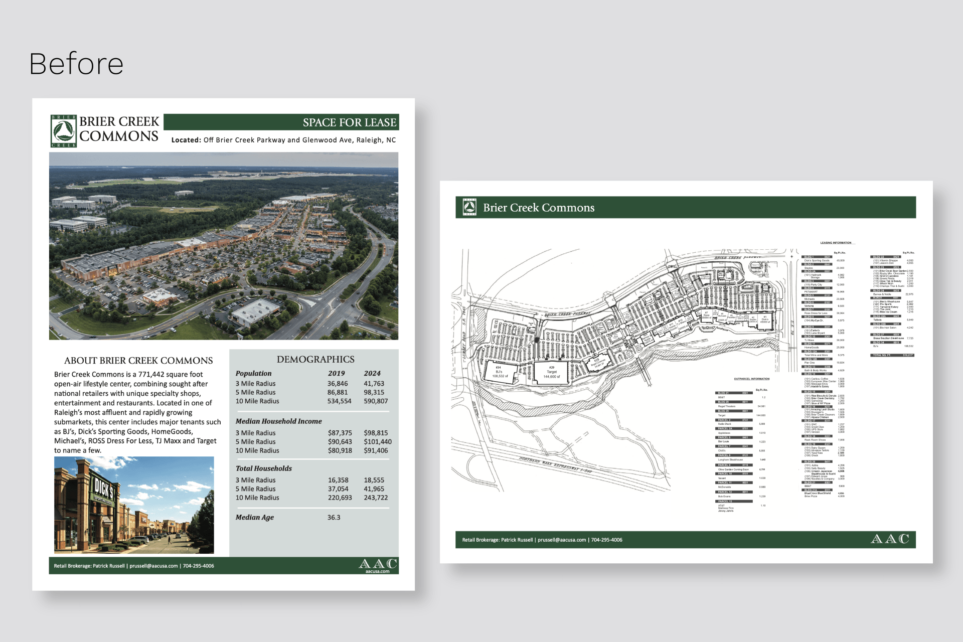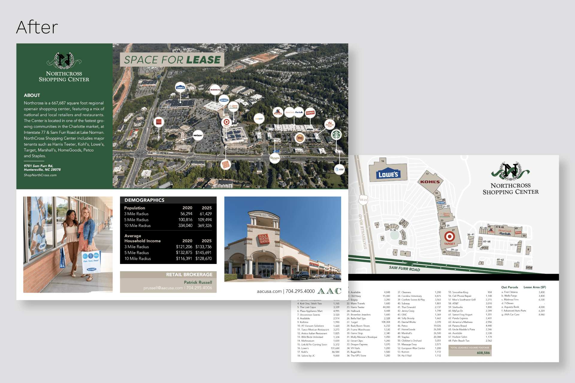 After each was completed, especially the brochures, they were constantly needing to be updated depending on new property listings (available spaces/out parcels) and tenants moving in and out. This was an ongoing project that required extreme attention to detail and needing to understand text and image hierarchy, especially when highlighting a new property that was leasable or for sale. I've listed what some of the outdated fliers looked like before I rebranded them and also a few that I newly created.