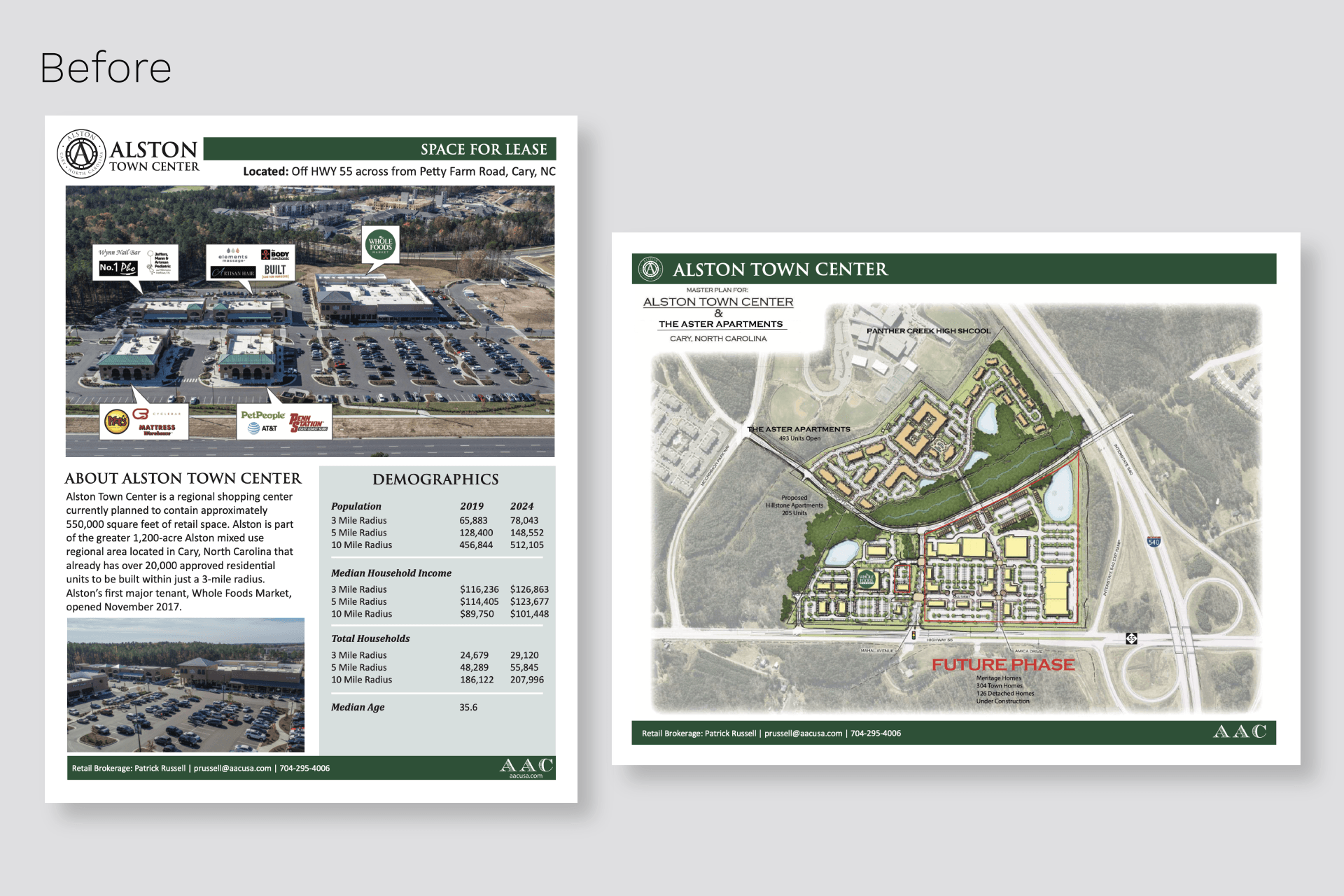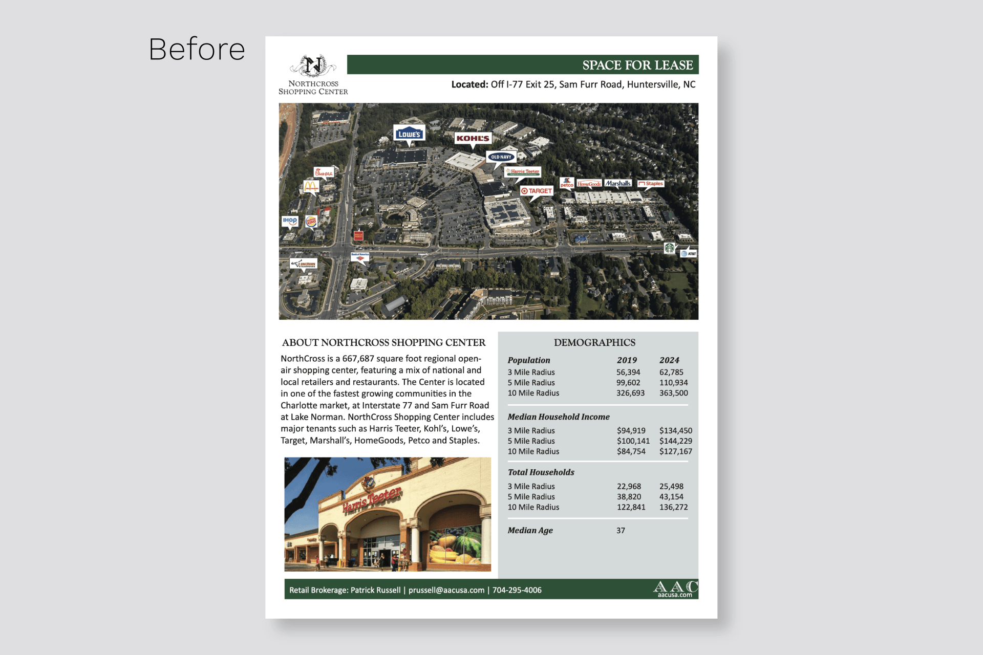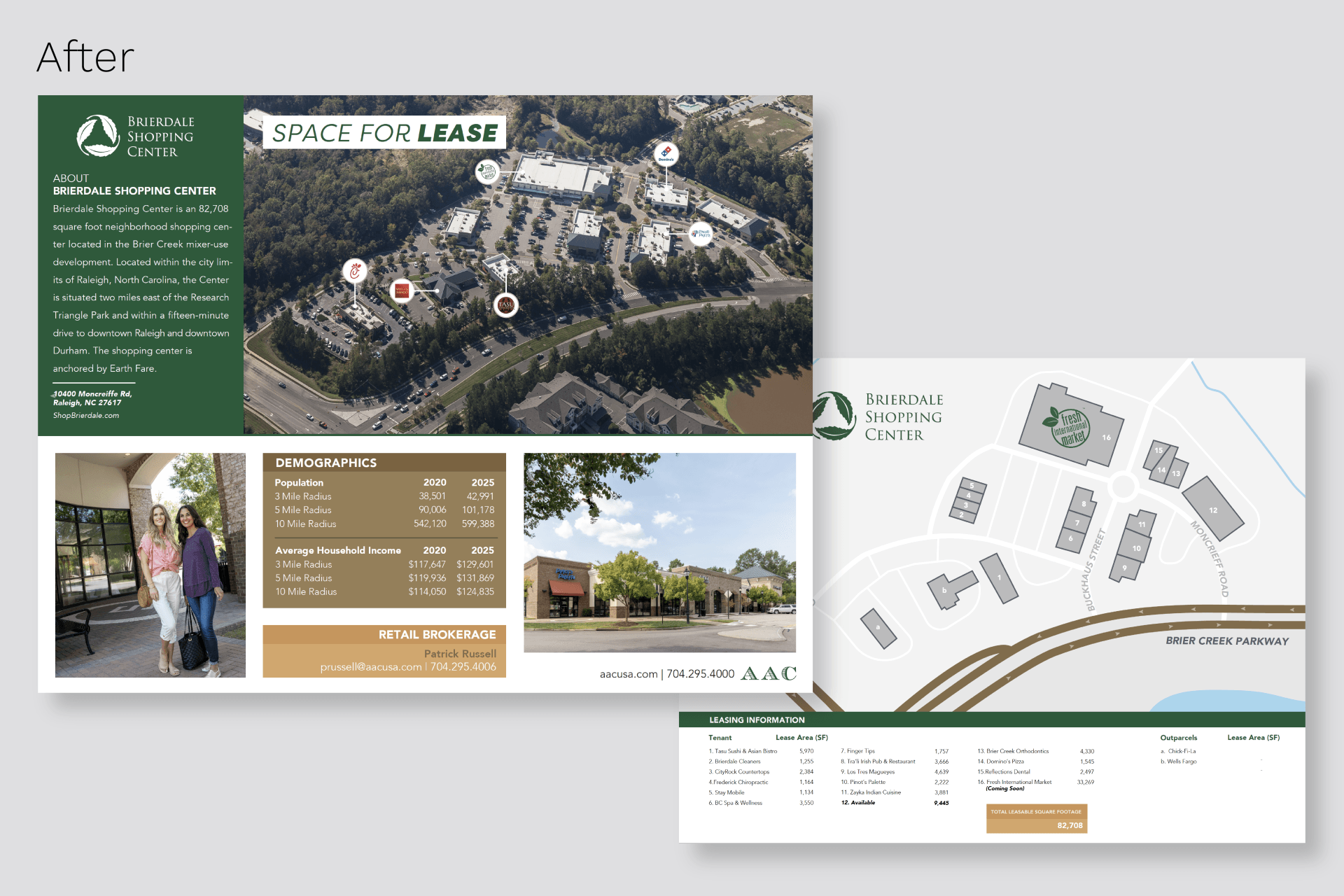 The majority of the redesign and branding process included updating outdated leasing fliers and brochures. I worked with the Marketing Coordinator and both Retail and Office Brokers to create these projects. I also used Esri.com