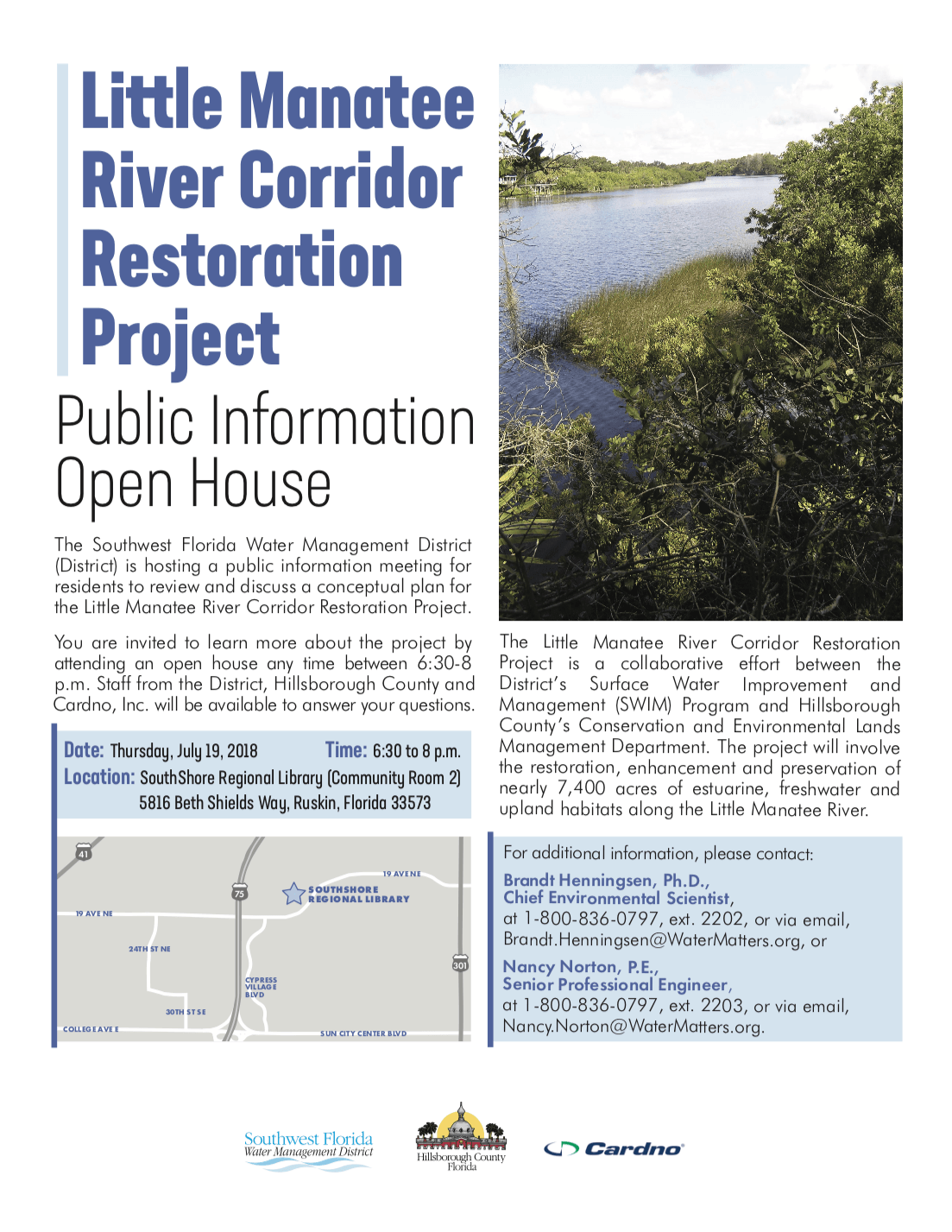 The Little Manatee River Corridor Restoration Project is a collaborative effort between the District’s Surface Water Improvement and Management (SWIM) Program and the Conservation and Environmental Lands Management Department of Hillsborough County. The project will involve the restoration, enhancement and preservation of almost 7,400 acres of estuarine, freshwater and upland habitats along the Little Manatee River.
