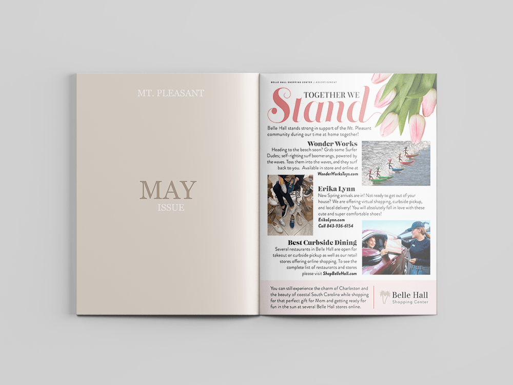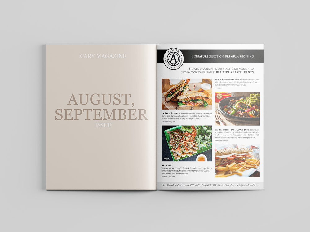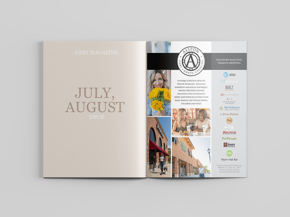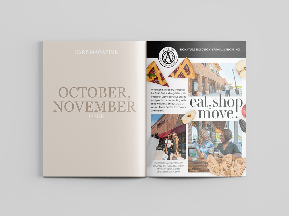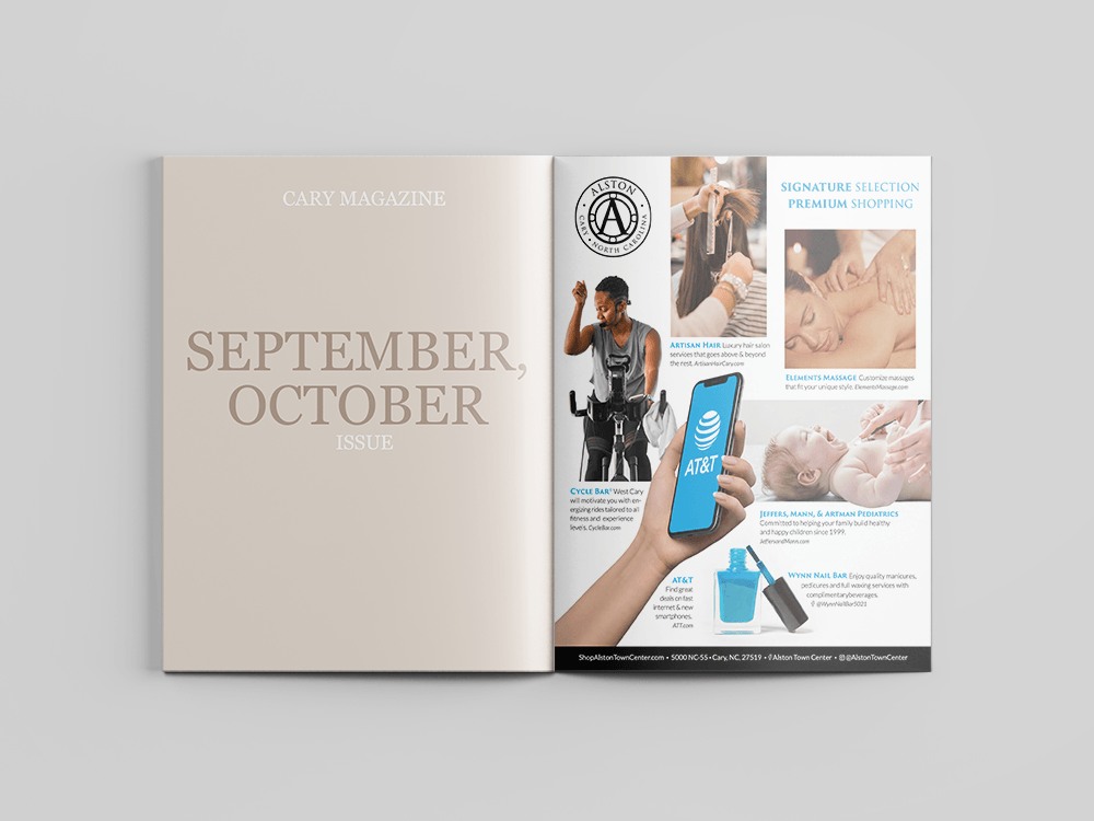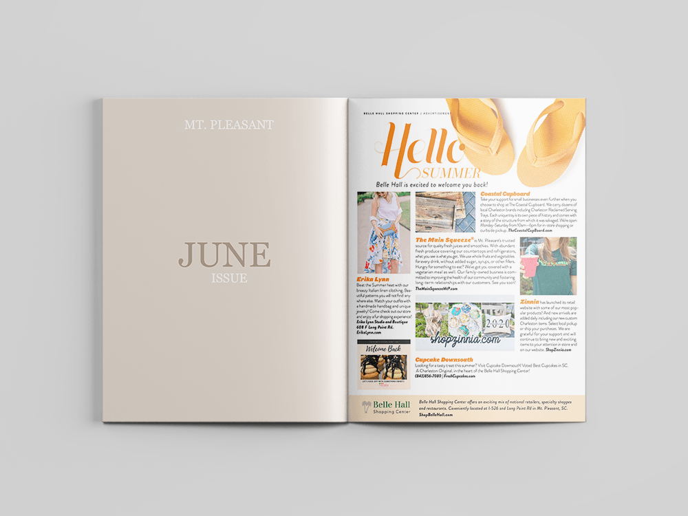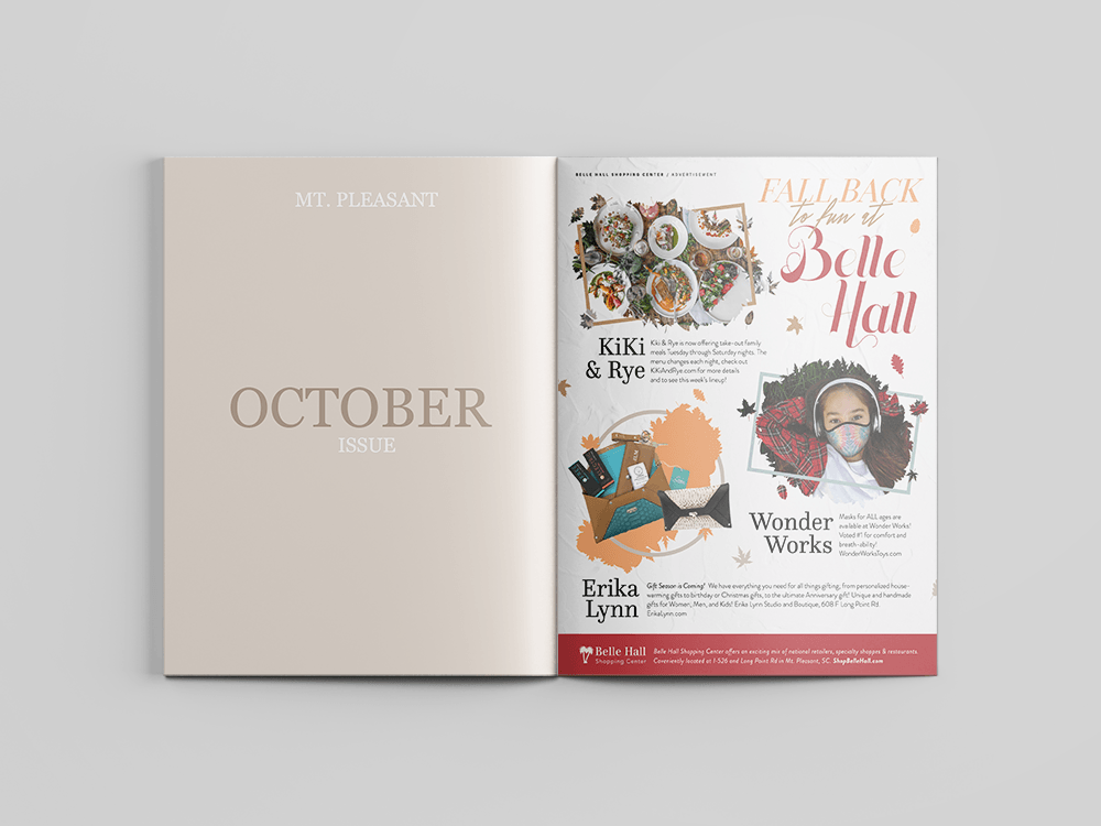 I created monthly magazine ads for two of our retail sites: Alston Town Center and Belle Hall. Ads were created based on themes, holiday, seasons and other events. I also wrote copy.
