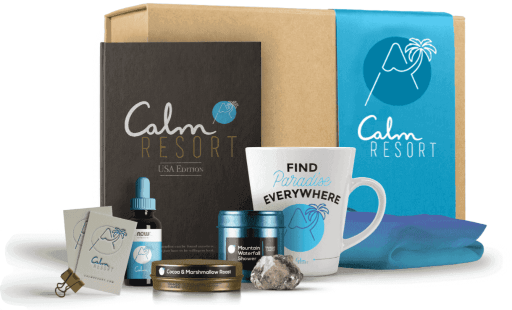 While everyone is not able to leave their spaces or get a real feeling of comfort and relaxation not being physically away, we wanted to incorporate subscription boxes to help set the mood for the ideal environment. Customers can both subscribe to receive monthly boxes with new "locations" or purchase them from the Calm Resort. For first-time subscribers boxes will come with promo items including a healing stone and a sweatshirt. All boxes include thank you and business cards.