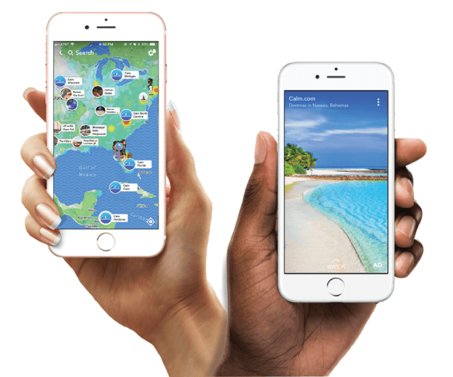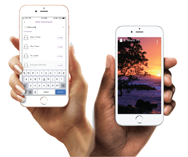 Snap Map, Snapchat's newest feature, stories submitted to Snapchat's "Our Stories" can be viewed by anyone. With the Calm.com, we could use special locations from team members to post everyday so that our target can easily access locations they can feel calm in. Between Snap stories, we will advertise Calm.com and people to follow from different locations.